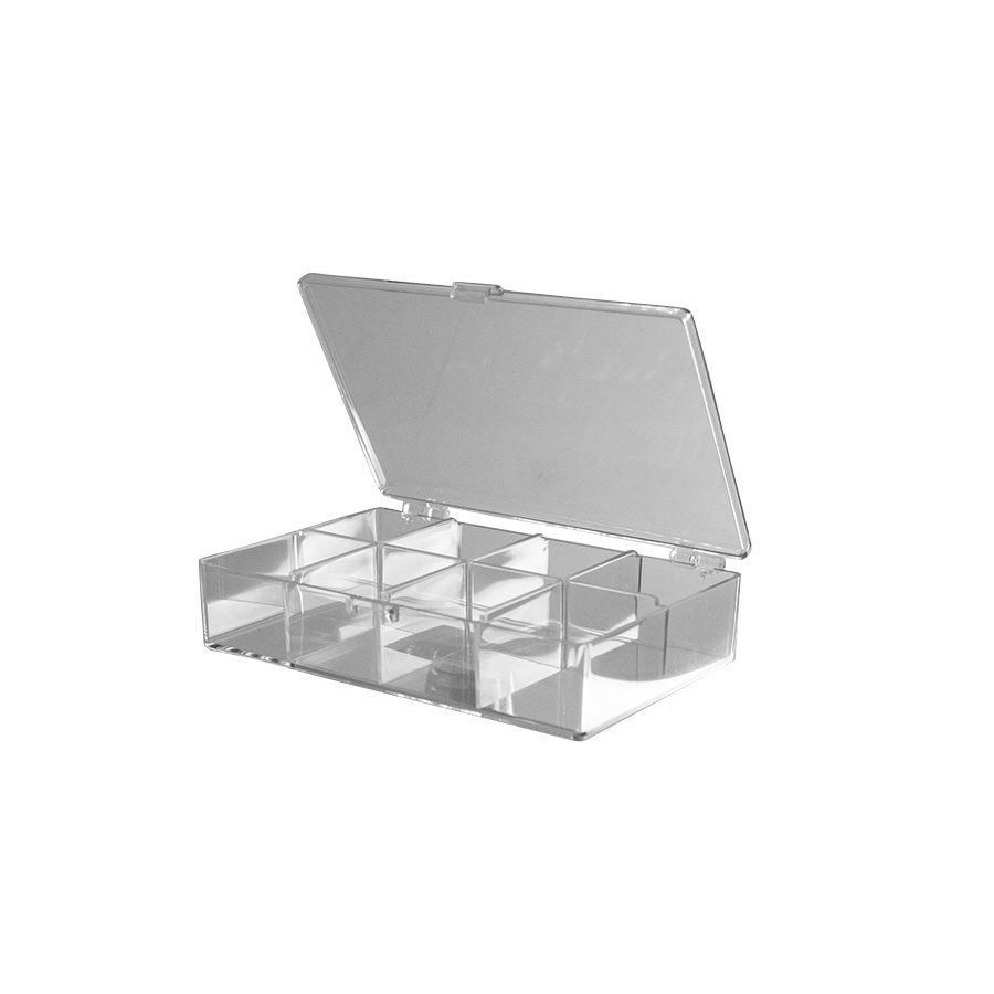 É uma caixa de acrilico com 8 compartimentos, de acrilico e transparente.