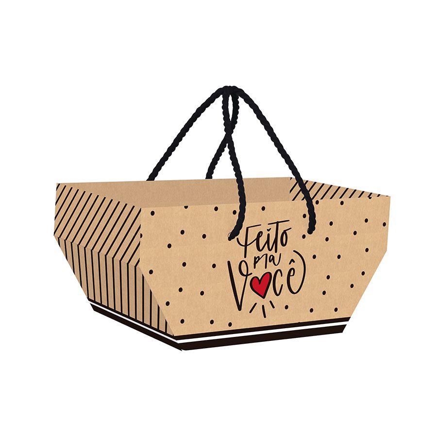 Feito com Amor, Feito com Doçura, Feito para Você, Praticidade do Kraft com o Carinho do Artesanal! A Caixa Cesta com Alça é uma super novidade também conhecida como Cesta na Caixa, Cesta de Papel, entre outros. Com impressão frente e verso, a cesta é uma ótima opção para montar um kit e fazer uma surpresa incrível! Sugestar para montar o kit: Caixa com Bombons, chocolates, doces, biscoitos, sucos de caixinha, pelúcias.