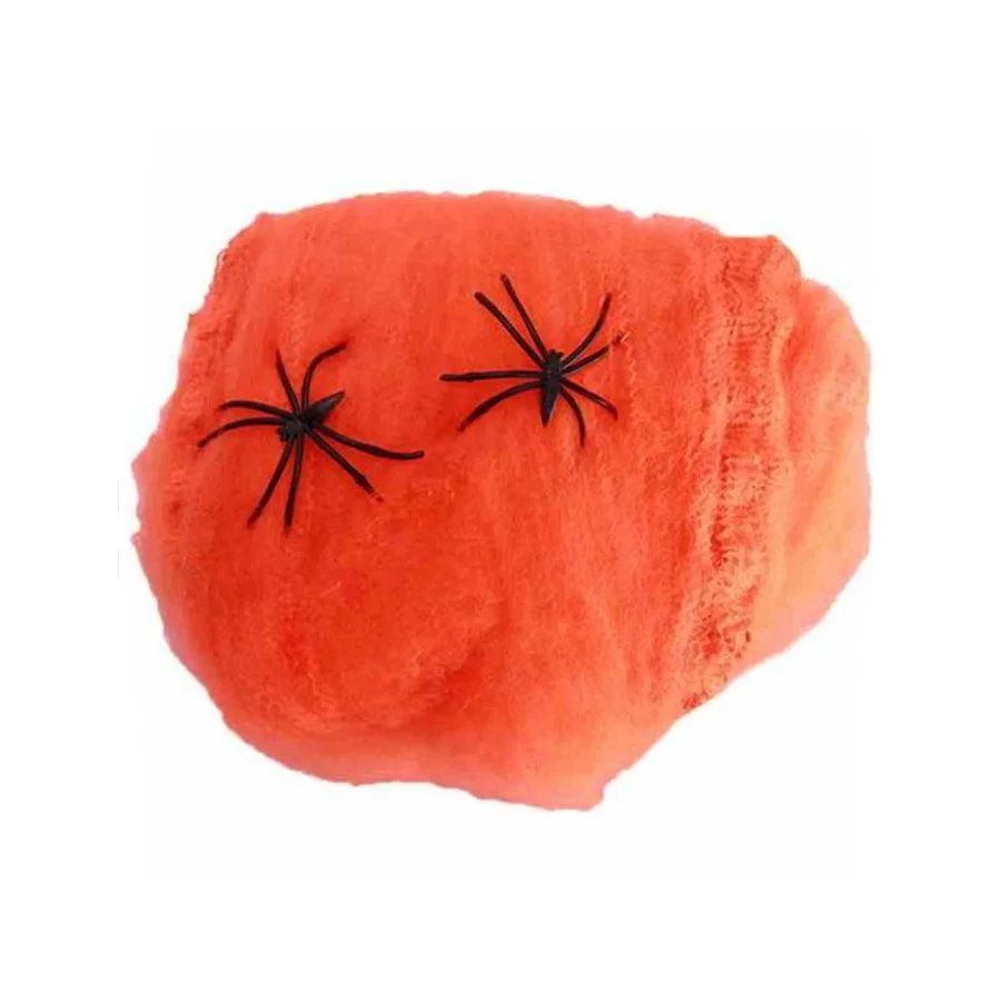 Possui 1 pacote de teia de aranha na cor laranja e 2 aranhas