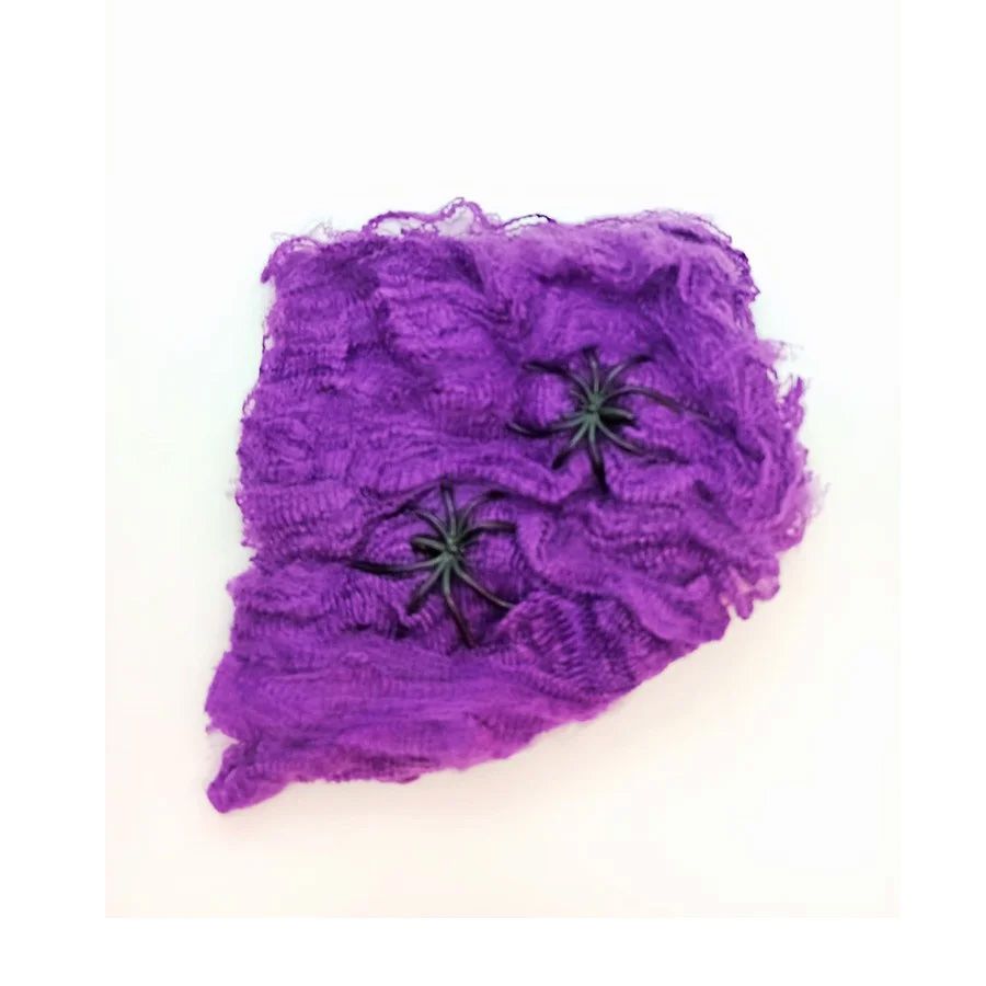 Possui 1 pacote de teia de aranha na cor roxo e 2 aranhas