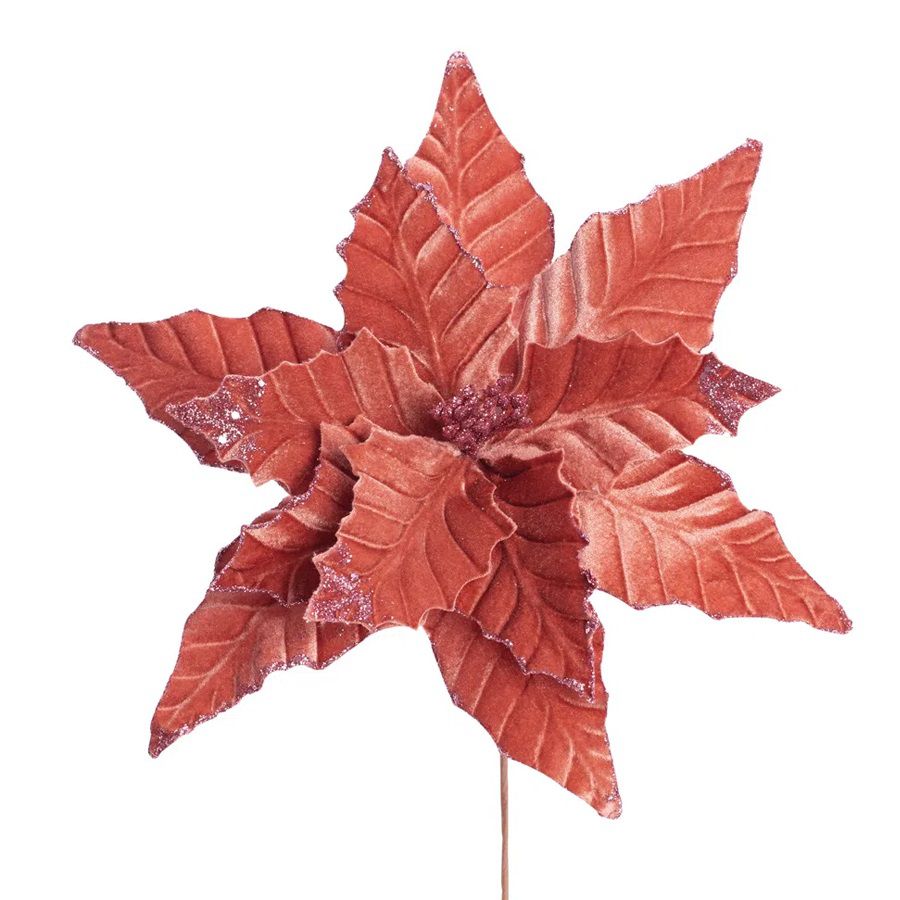 A flor possupi um tecido de cor rose gold aveludada, que imita as petalas. Seu miolo tem as frutinhas revestidas de gliter rose e seu cabo é marrom.