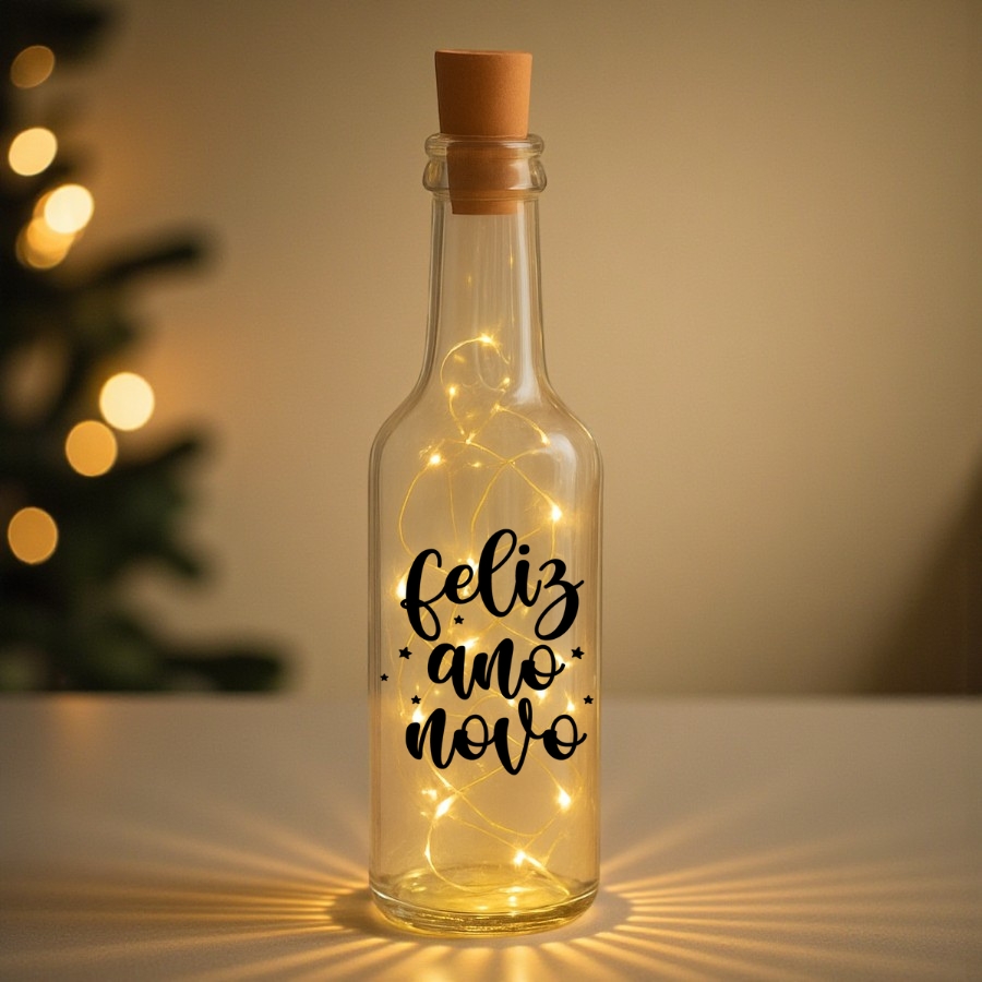 1 Garrafa de Vidro + 1 Rolha com Fio de Led + 1 Transfer (já aplicado na garrafa)