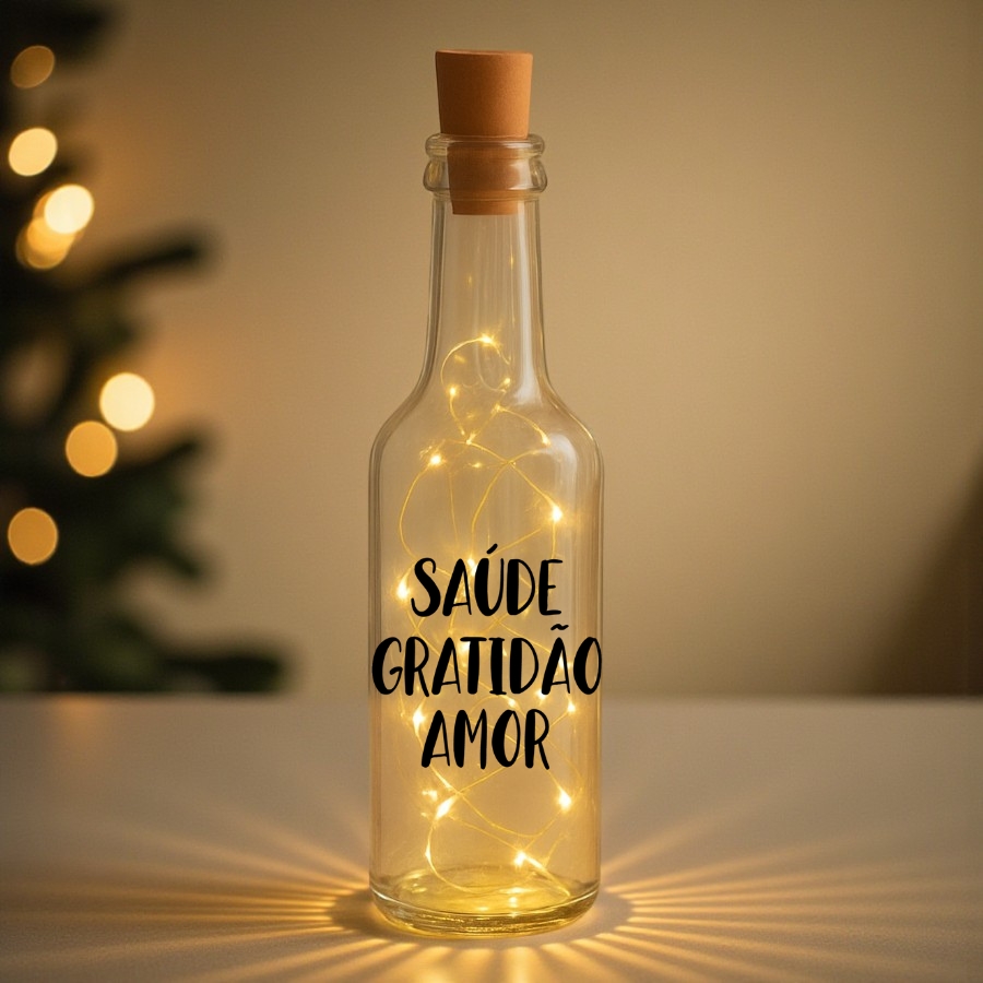 Garrafa Long Neck de Vidro com Rolha Led Saúde Gratidão Amor Mod2 - 01 Unidade - Rizzo