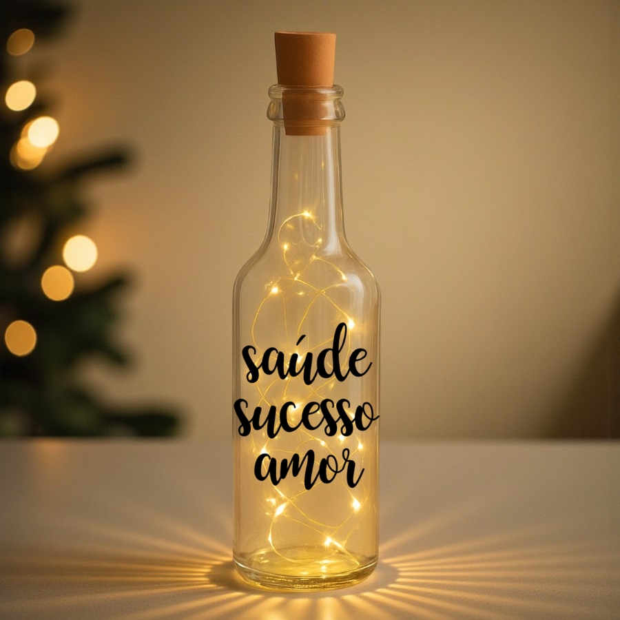 1 Garrafa de Vidro + 1 Rolha com Fio de Led + 1 Transfer (já aplicado na garrafa)