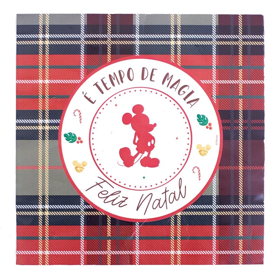 O guardanapo com estampa xadrez nas cores verde e vermelho, em seu centro possuí a silhueta do Mickey e em volta a escrita na cor preta "É tempo de magia" e "Feliz Natal".