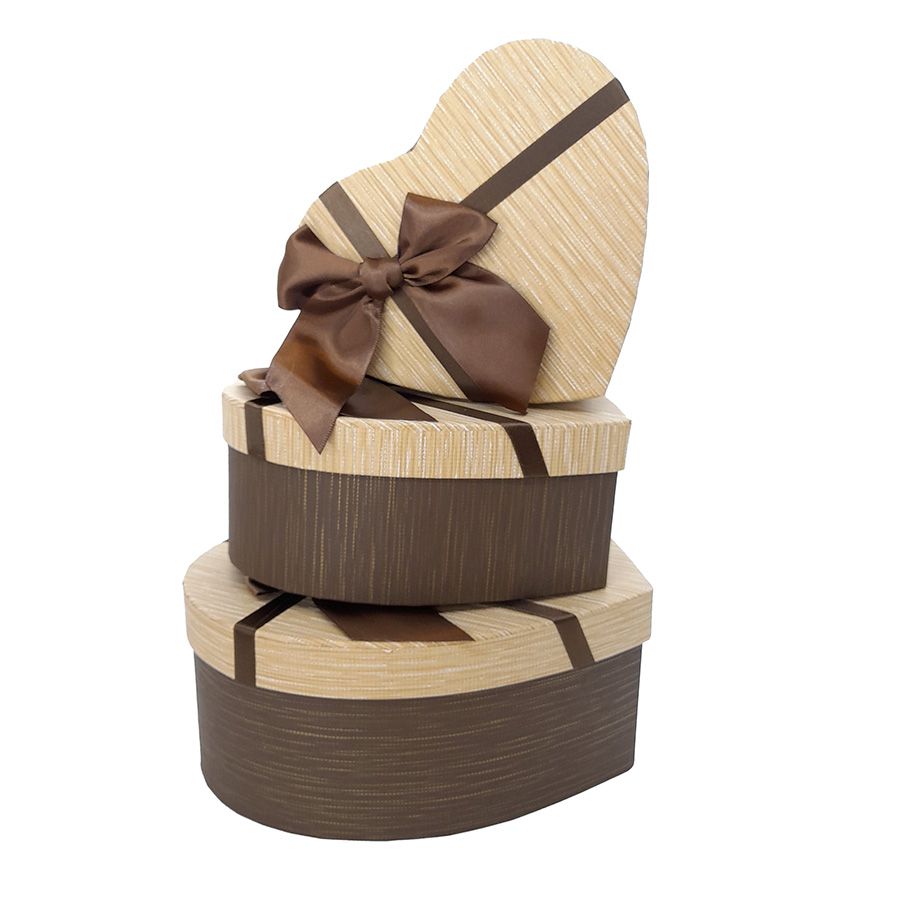 O kit possui 3 caixas papel rígido coração na cor marrom tampa bege com laço marrom e medem Caixa 1: 15 cm x 13 cm | Caixa 2: 18 cm x 16 cm | Caixa 3: 21 cm x 19 cm