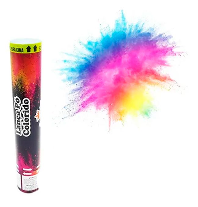 Lançador de confetes em pó. Siga as instruções na embalagem para o uso correto. Cuidado, pode causar acidentes.