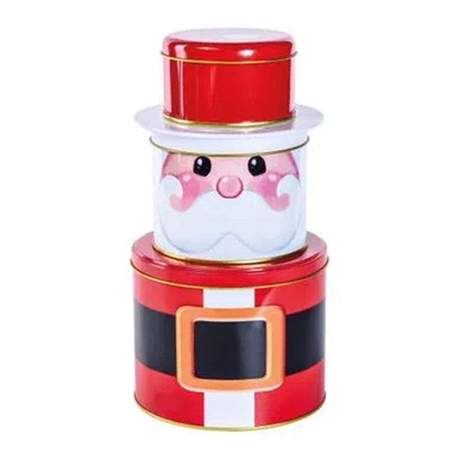 A Lata possuí 3 degraus, cada um completa uma parte do papai noel. A base, que é a maior parte e a mais larga, é vermelha e possuí o cinto do Papai Noel. A segunda parte que fica em cima da base é branca e possuí o rosto do Papai Noel estampado. E em cima de todas, fica a terceira parte e potinho, o menor, e está simbolizado pela touca vermelha do Papai Noel. As tres partes juntas, uma em cima da outra, constituem em três potes e tem 26cm de altura.