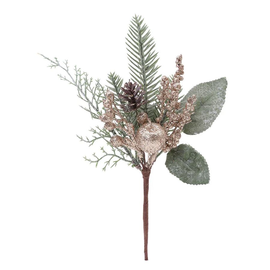 O pick imita um galho artificial com folhas verdes e frutos pintados com gliter dourado. Seu cabo é marrom e a mini pinha também.