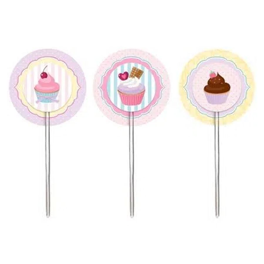Os picks possuem uma tag redonda na ponta do palito de plástico nas cores rosa, amarelo, azul pastel, com desenhos de cupcakes no centro.