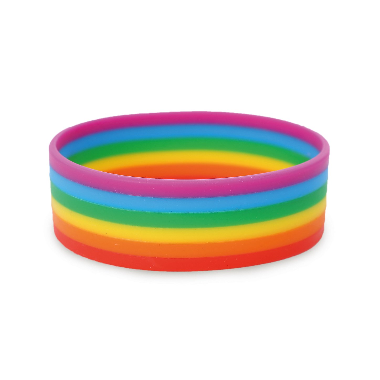 Uma pulseira de plastico pigmentado colorido nas cores do arco-irís com um tamanho de 7,5cm por 7,5cm