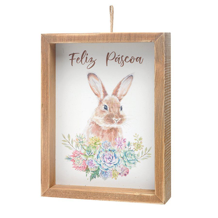Singelo quadro, ou placa, ou retrato de coelhinho com a mensagem "Feliz Páscoa". Item em madeira e que se harmoniza com qualquer decoração na sua casa.