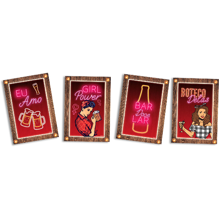 Um pacote contendo 4 unidades de quadros decorativos com o tema Boteco Delas