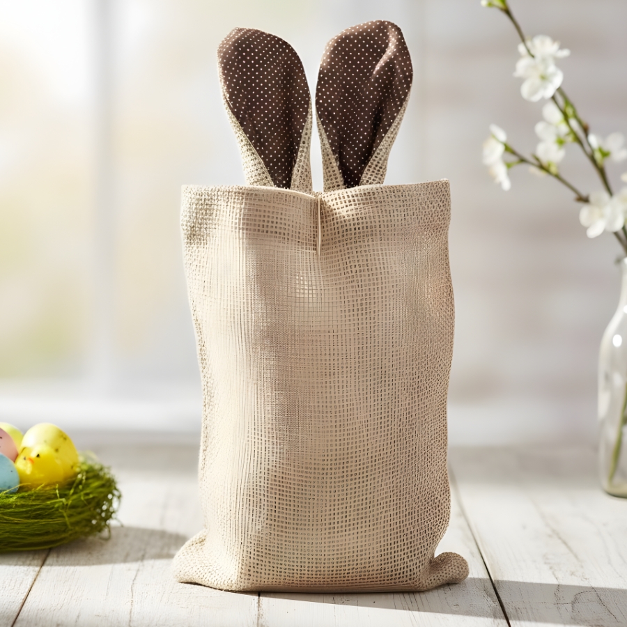 O Saco de Juta de Páscoa com Orelha Marrom Poá Branco é utilizado para embalar ovos, doces e lembranças de Páscoa. Produzido em juta com aplicação decorativa temática, combina funcionalidade e apelo visual para composições sazonais.