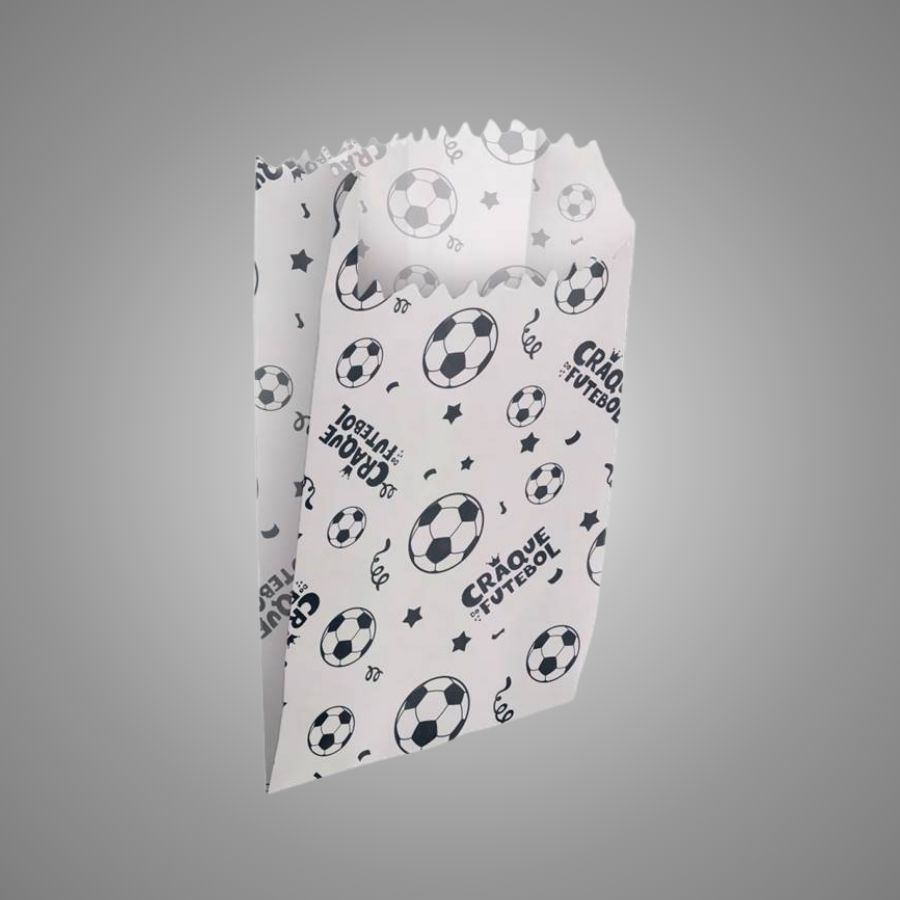Saco de papel temático de futebol com tamanho de 7,5x14cm, ideal para embalar doces, pipoca e pequenos brindes em festas infantis e eventos com tema esportivo.