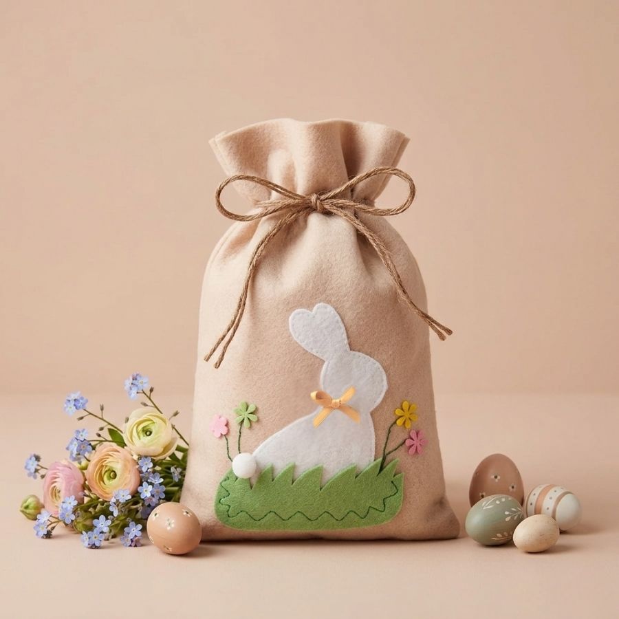Sua tonalidade nude suave confere neutralidade e elegância, permitindo que se harmonize facilmente com diferentes paletas de cores e estilos de decoração. O feltro proporciona textura aconchegante, tornando o saco perfeito para embalar ovos de Páscoa, doces, lembrancinhas ou pequenos presentes com muito estilo.