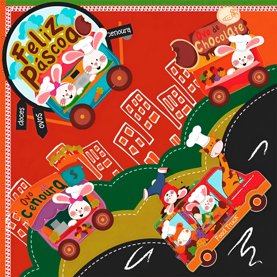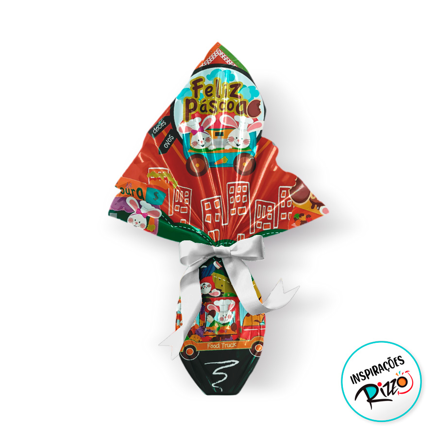Saco Express Metalizado, com estampa de coelhos em um food truck de ovo da pascoa