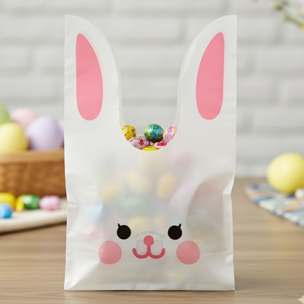 Dica: Após fechá-las com laço especial e colorido, você poderá também usar as Sacolas Coelho como decoração na sua mesa de Festa Páscoa.