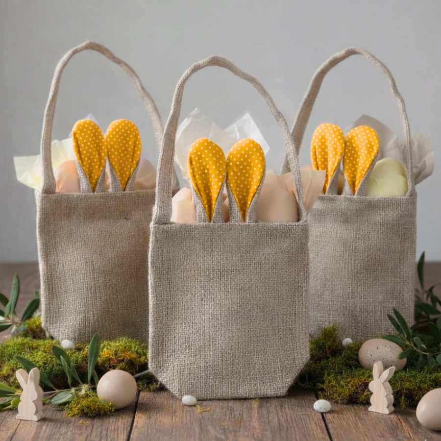 Confeccionada em juta, esta sacola decorativa é ideal para embalar ovos de Páscoa, chocolates, lembrancinhas e kits presenteáveis. Seu design diferenciado com orelhas decorativas valoriza a apresentação e torna a embalagem parte da decoração. Indicada para uso residencial ou comercial, é perfeita para compor vitrines, mesas temáticas e ações sazonais de Páscoa.