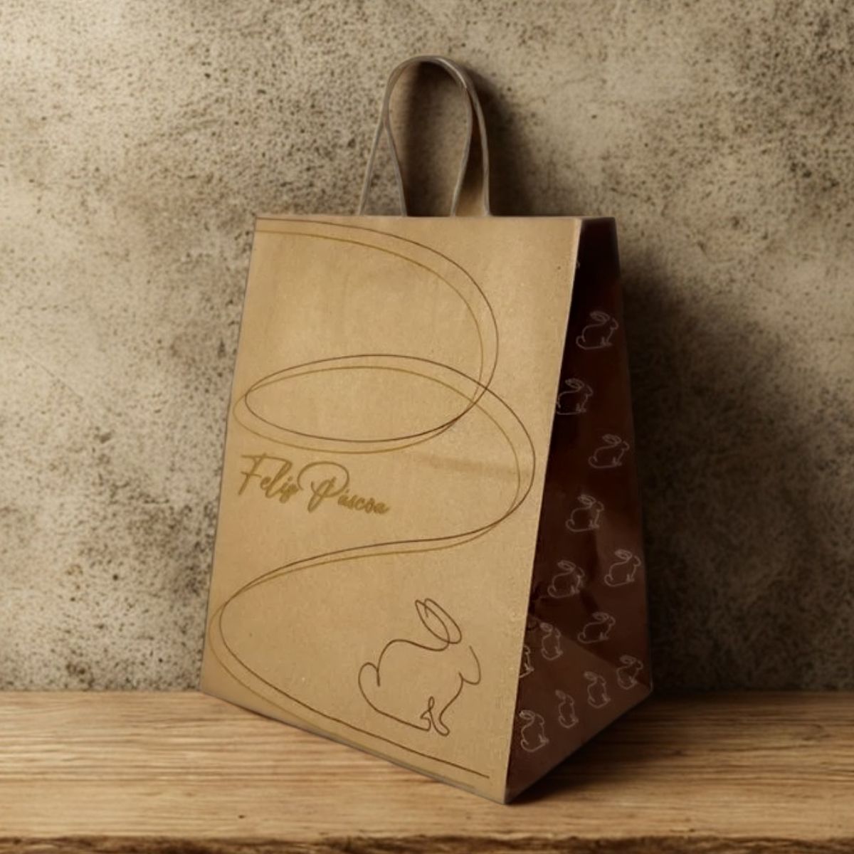 A Sacola de Papel Kraft - Nat Coelho Dourado - 13,5x8x19cm é perfeita para embalar lembrancinhas e presentes de Páscoa com muito charme e elegância. O kit vem com 10 unidades, confeccionadas em papel kraft resistente, com estampa de coelhinho e a frase “Feliz Páscoa” em preto e dourado, combinando simplicidade e sofisticação. Ideal para quem deseja uma apresentação bonita e temática, sem abrir mão de um visual moderno e delicado.