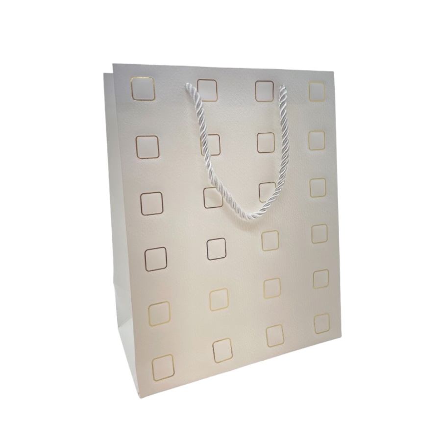 Sacola de papel para presente na cor branca, com desenhos de quadrados almofadados com contorno em dourado