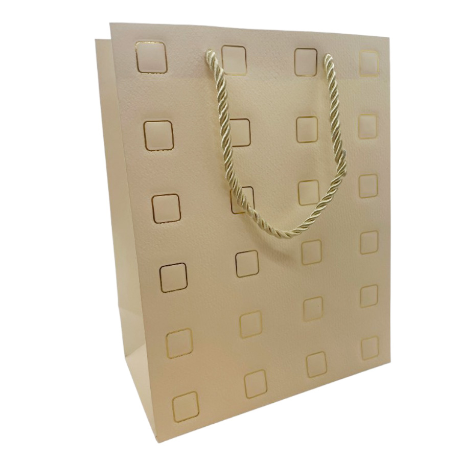 Sacola de papel para presente na cor creme, com desenhos de quadrados almofadados com contorno em dourado