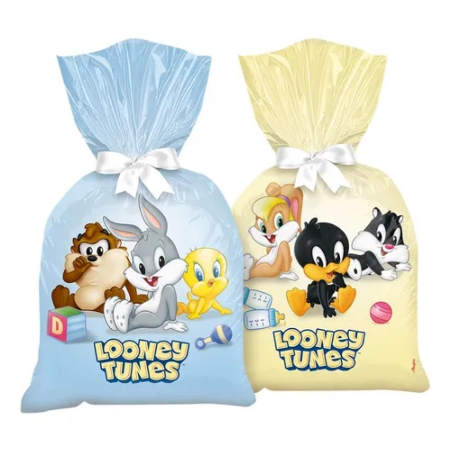 Sacola plástica com tema Looney Tunes, medindo 14x27cm. Ideal para embalar lembrancinhas, doces ou pequenos brindes em festas infantis, com um design divertido e colorido dos personagens clássicos.