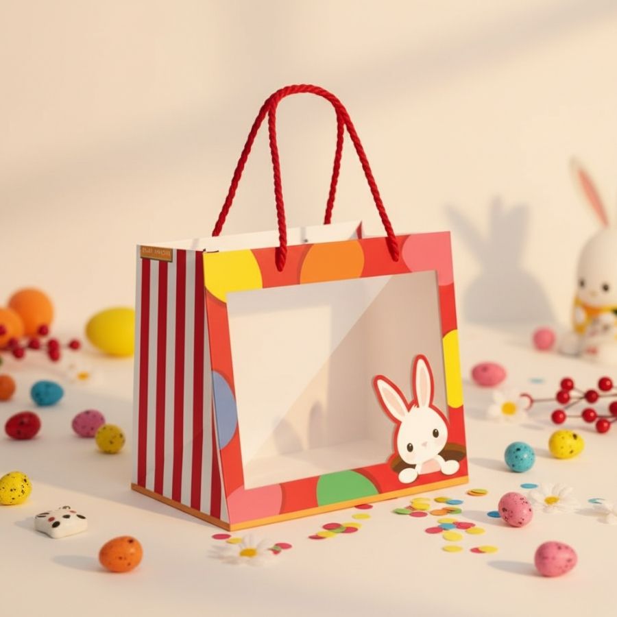 Perfeita para embalar ovos de Páscoa, doces, kits de chocolates ou lembrancinhas temáticas, a sacola combina praticidade e charme. Seu design premium com o Coelhinho Sai Da Toca Vermelho agrega um toque lúdico e divertido, tornando cada presente ainda mais memorável. Com tamanho 30x26x14cm, acomoda caixas de diferentes formatos e oferece versatilidade para composições personalizadas, sendo ideal para lojas, festas e presentes especiais.