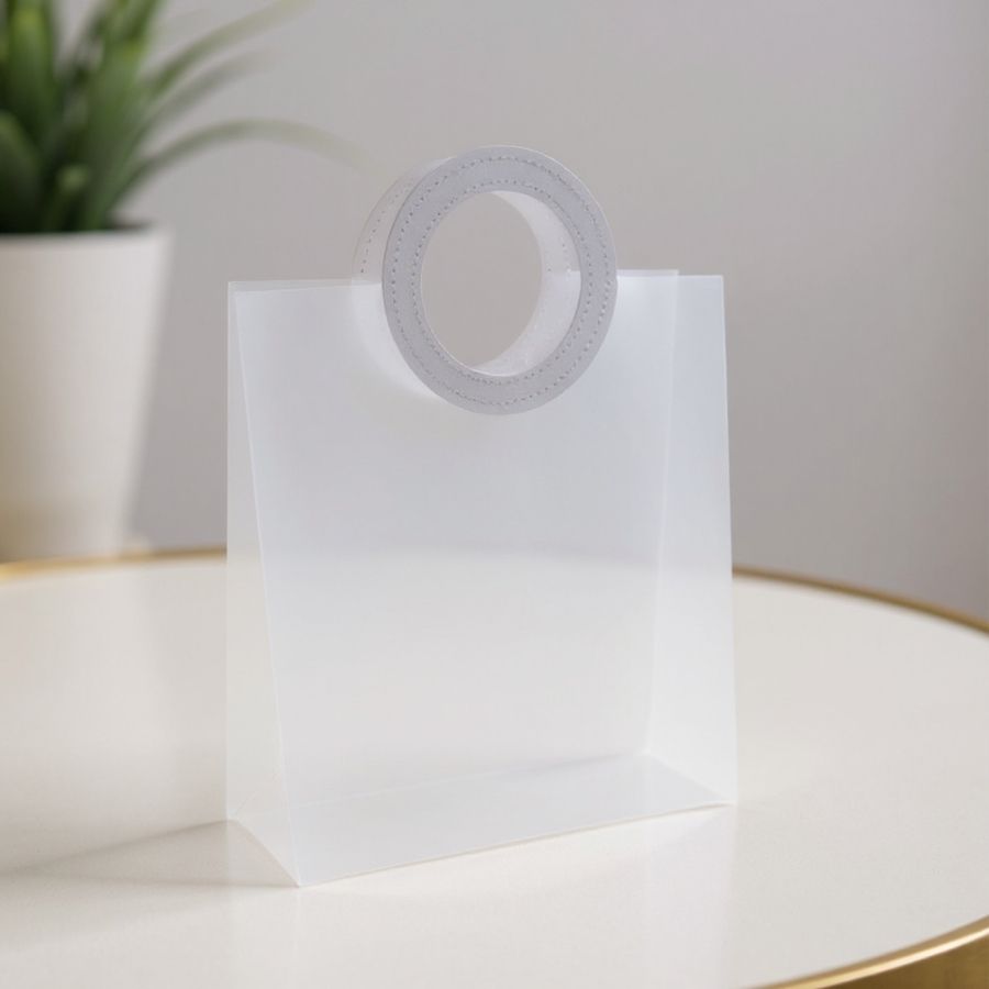 Sacola transparente de PVC com alça redonda de couro branca, 23x20x10cm, resistente, prática e sofisticada, ideal para lembrancinhas, presentes e projetos artesanais.