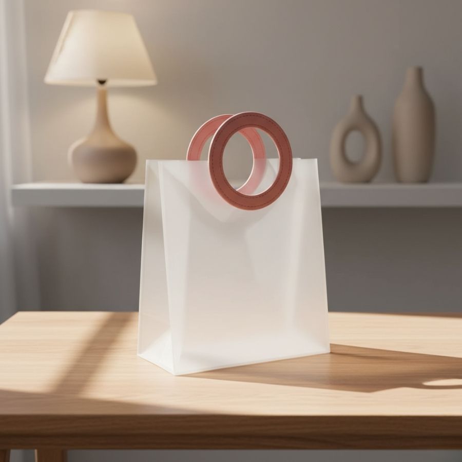 Sacola transparente de PVC com alça redonda de couro rosa, 23x20x10cm, prática, resistente e charmosa, ideal para lembrancinhas, presentes e projetos artesanais.