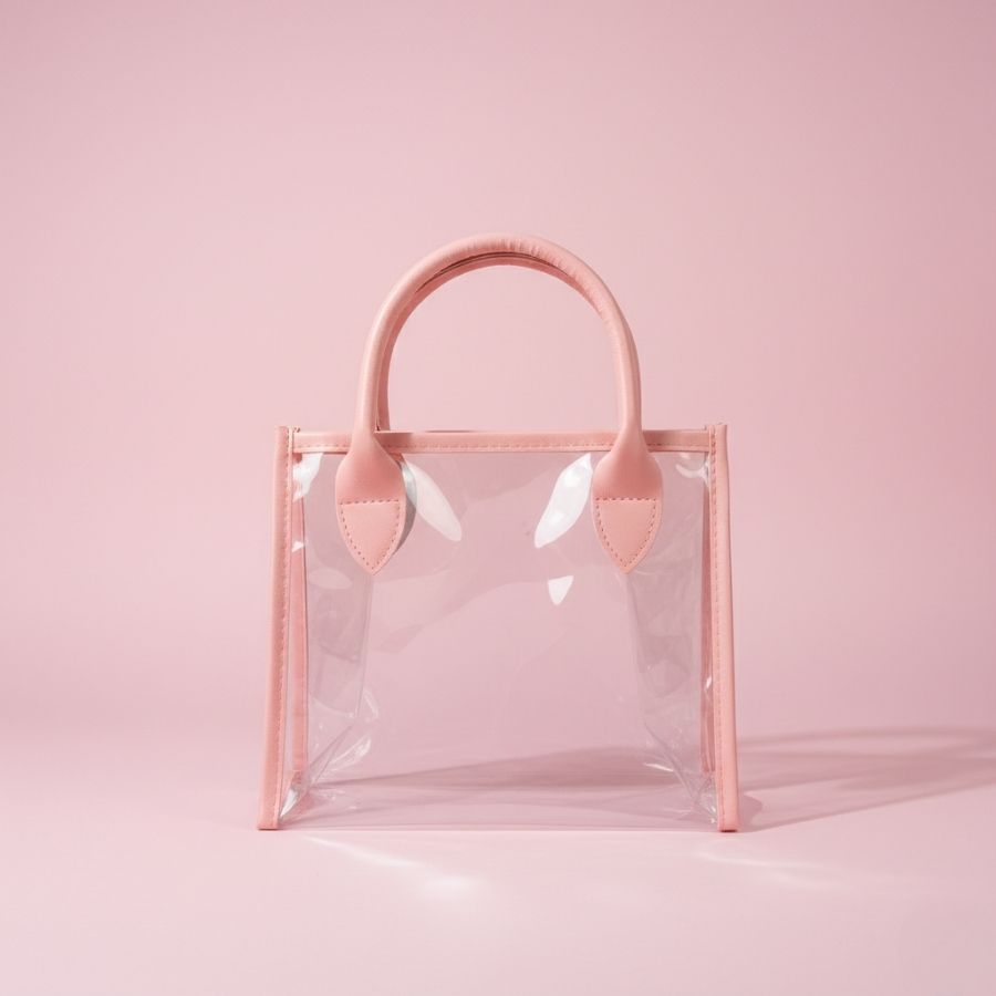 Sacola transparente em PVC com alça rosa em PU, tamanho 22x11x19 cm, resistente e ideal para presentear, organizar e valorizar produtos.