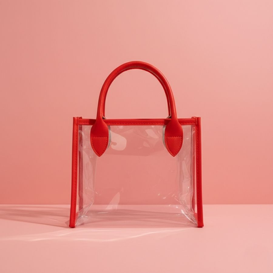 Sacola transparente em PVC com alça vermelha em PU, tamanho 22x11x19 cm, resistente e ideal para presentear, organizar e valorizar produtos.