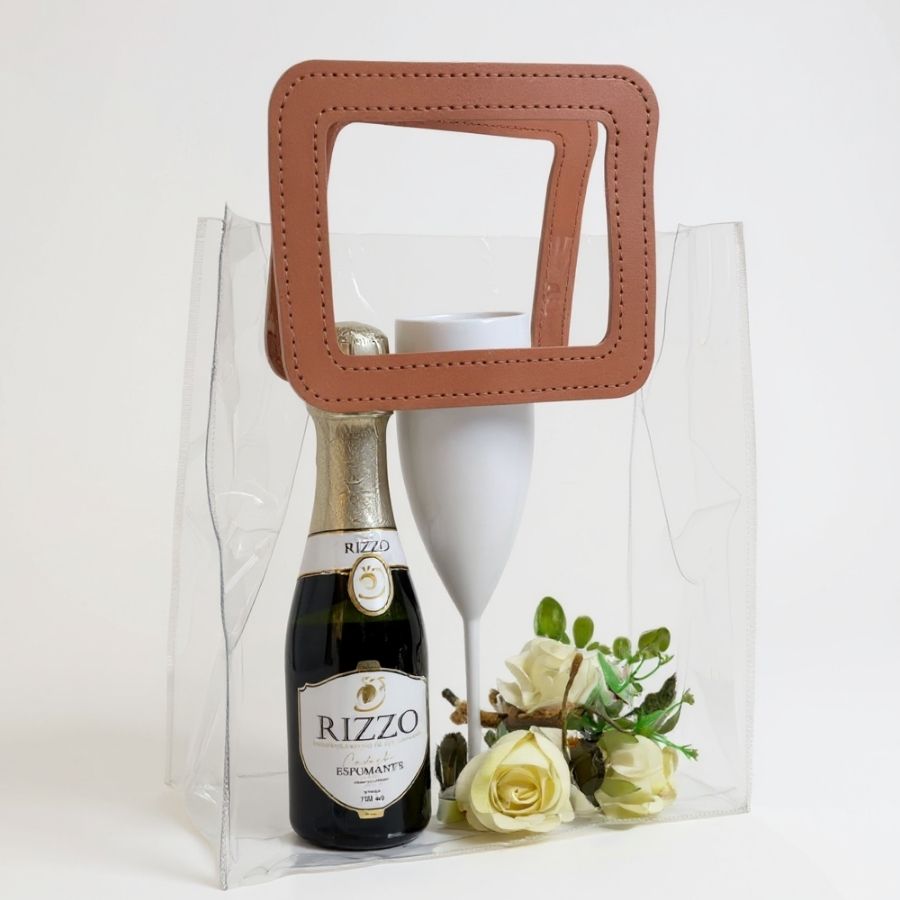 A Sacola Transparente Fosca PVC com alça retangular em couro rosa é resistente, prática e sofisticada, ideal para lembrancinhas, presentes e embalagens de festas e eventos.