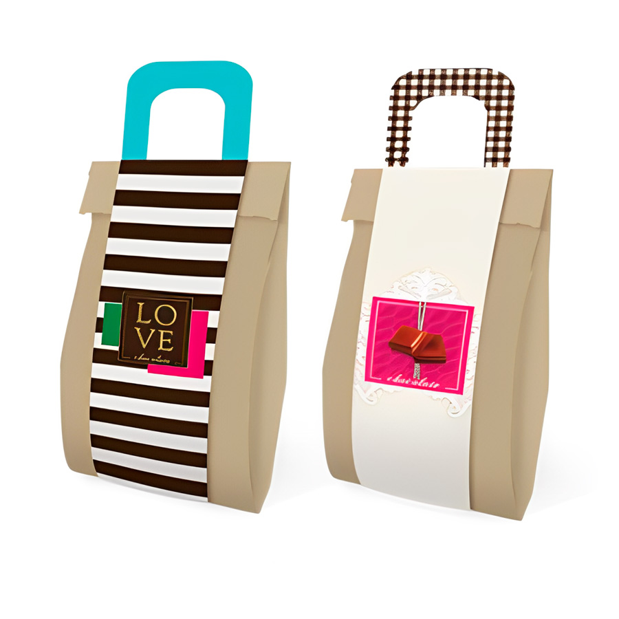 Saquinho de papel acompanhado de fechamento de cartão com alça, em 2 modelos de cinta, com textura e estampa diferente, uma tendo o fundo listrado de branco e marrom destacando quadrados coloridos com quadrado marrom sobre eles, com a mensagem "Love Chocolate" e alça azul, o outro modelo tem o fundo na tonalidade creme destacando uma figura arasbesco branca com um quadrado rosa choque com a imagem de 2 blocos de chocolate e a mensagem "Chocolate" abaixo da imagem, com a alça xadrez branca e marrom