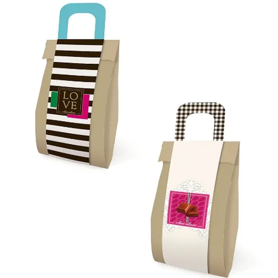 Pacote de saquinho de papel kraft com 2 modelos de cintas diferentes, uma listrada marrom e branco, destacando um quadrado com a mensagem "LOVE" e alça azul, e outra bege claro destacando um quadrado Rosa sobre um arabesco branco com imagem de 2 quadrados de chocolate e a palavra "chocolate" abaixo da imagem