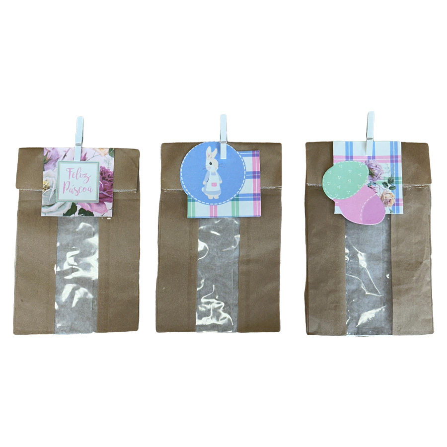 Saquinho de papel kraft com visor em faixa vertical, com 10 mini pregadores de madeira e 10 cartões em 3 modelos diferentes
