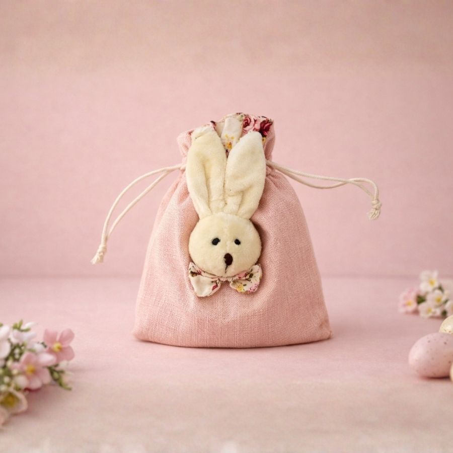 Saquinho de tecido rosa com temática de Páscoa, ideal para lembrancinhas, embalagens e decoração de festas.