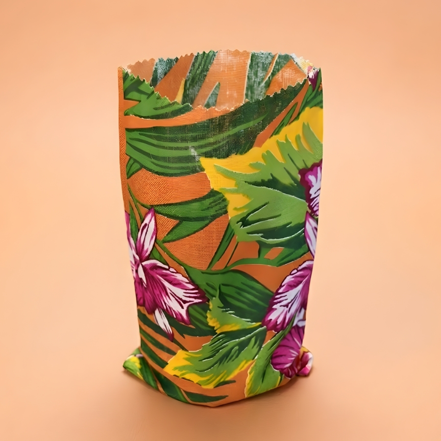 Saquinho fabricado em papel com estampa chita nas cores laranja, verde e rosa. Possui dimensões aproximadas de 14x23cm. Indicado para acondicionar alimentos secos, como pipoca e hot dog, em festas e eventos temáticos. Produto não indicado para contato com líquidos. Recomenda-se armazenar em local seco e manusear com cuidado para preservar o material.