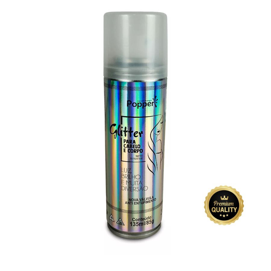 Spray de glitter holográfico para corpo e cabelo, com brilho intenso e secagem rápida. Ideal para festas, eventos e Carnaval.