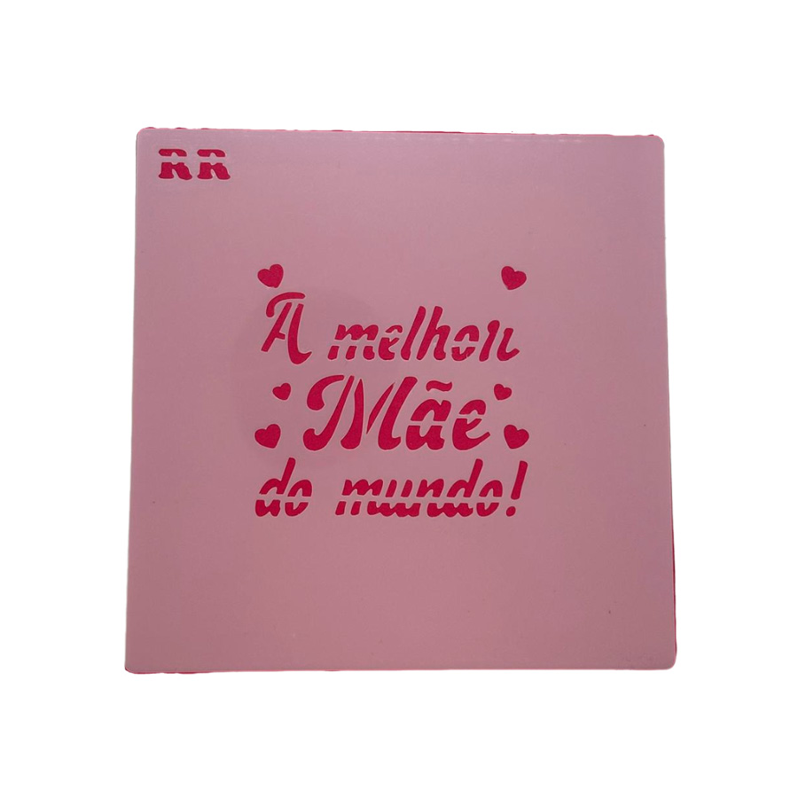 Estêncil em poliéster leitoso com a mensagem "A Melhor Mãe do Mundo!" com corações ao redor