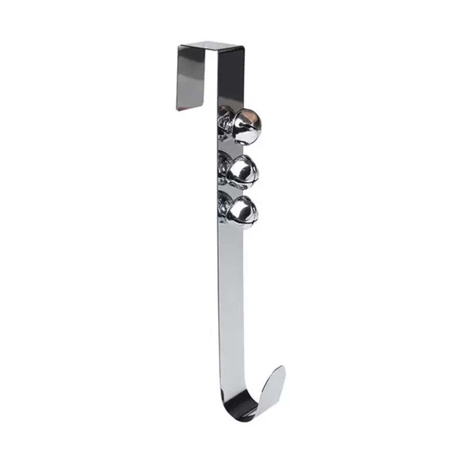 O suporte da cor prata, possuí três guizos no seu comprimento, em uma ponta está o suporte para pendurar na porta e na outra para colocar a aguirlanda.