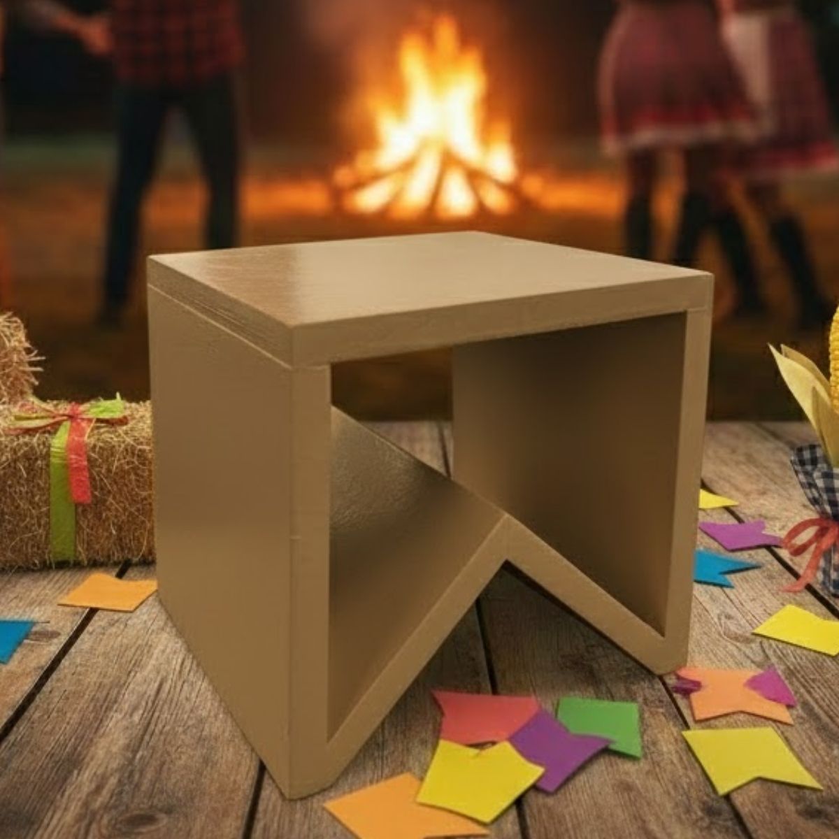 Use o suporte de madeira em mesas de doces, cantinhos juninos ou aparadores decorativos. Combine com bandeirinhas, juta, palha e outros enfeites rústicos para montar uma decoração completa de festa junina, ideal para eventos, escolas e comemorações temáticas.