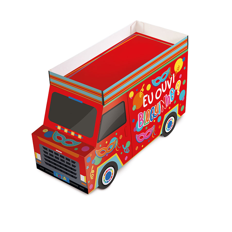 Um pacote contendo uma unidade de Suporte para doces de papel cartão em formato de trio eletrico, escrito; "eu ouvi bloquinho?" com a cor vermelha sendo predominante