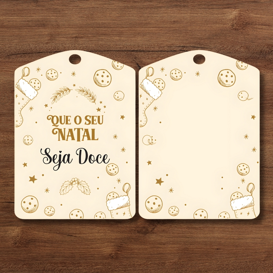 O lado frontal apresenta a frase “QUE O SEU NATAL Seja Doce” em letras decorativas, adornada com ilustrações de meias de Natal, biscoitos, estrelas e pontos semelhantes a flocos de neve, em tons de bege e dourado. O lado posterior mantém o mesmo estilo decorativo, mas a área central é deixada em branco para escrever mensagens personalizadas. Esta tag é perfeita para embalagens de presentes, kits natalinos e doces artesanais, combinando beleza, praticidade e delicadeza.
