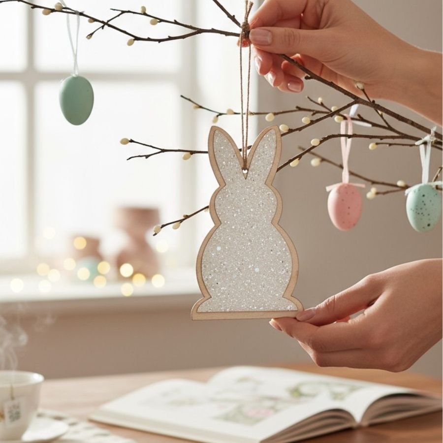 O Tag Decorativa de Páscoa em MDF - Coelho de Glitter Branco - 10,5x6cm é perfeita para quem deseja adicionar charme, brilho e delicadeza às lembrancinhas, presentes e embalagens de Páscoa. Com acabamento em glitter branco e formato de coelho, a tag transforma cestas, sacolas, caixas de presente e arranjos decorativos em composições elegantes e temáticas.