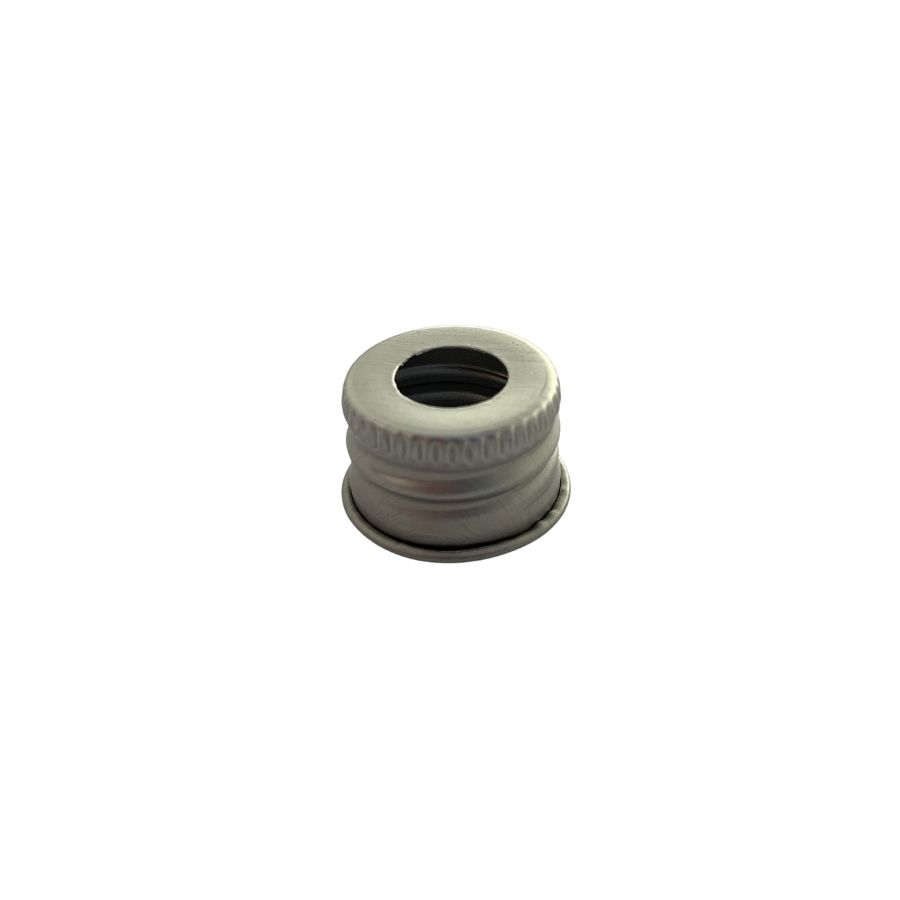 Tampa de alumínio prata com furo e virola, rosca 18. Ideal para frascos de difusores de palito com rosca 18.