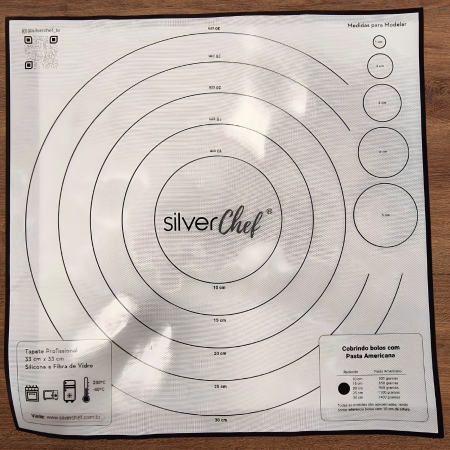 Tapete fabricado em fibra de vidro e silicone, com dimensões aproximadas de 33x33cm. Indicado para uso como superfície de apoio durante o preparo de alimentos. Recomenda-se utilizar o produto em superfícies planas e mantê-lo limpo após o uso. Seguir as instruções de utilização presentes na embalagem do produto quando disponíveis.