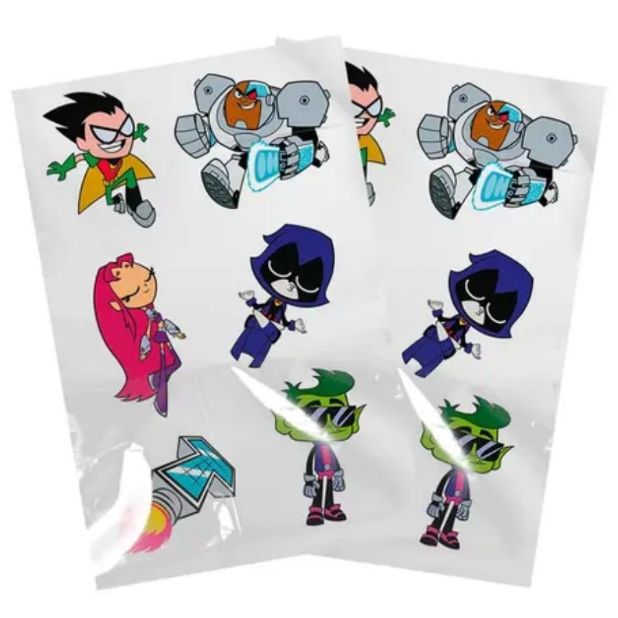 Tatuagem de pele Jovens Titãs GO!, com 2 cartelas contendo 6 tatuagens cada. Cada cartela traz uma tatuagem de cada personagem principal da série e uma com a imagem da Torre dos Titãs. Divertidas e seguras, são perfeitas para entreter as crianças durante a festa ou como lembrancinha temática.
