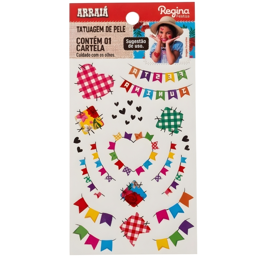 Cartela de tatuagens temporárias para aplicação na pele com temática Arraiá Menina. Contém 36 tatuagens com diferentes estampas temáticas. Produto destinado ao uso decorativo temporário sobre a pele. Recomenda-se aplicar sobre pele limpa e seca e remover conforme instruções do fabricante. Evitar aplicação sobre pele sensível, irritada ou lesionada.