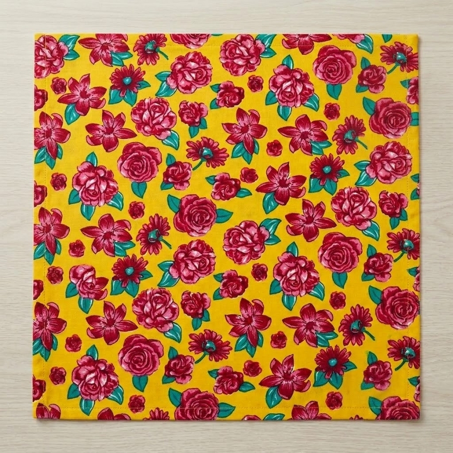 Toalha de mesa com estampa chita nas cores amarelo e rosa, com padrão floral. Possui dimensões aproximadas de 68x67,5cm. Indicada para uso decorativo em mesas durante festas juninas e eventos temáticos. Produto leve e de fácil aplicação. Recomenda-se evitar contato com umidade excessiva e objetos que possam danificar o material. O produto pode conter pequenas variações de cor e tamanho dependendo do lote.
